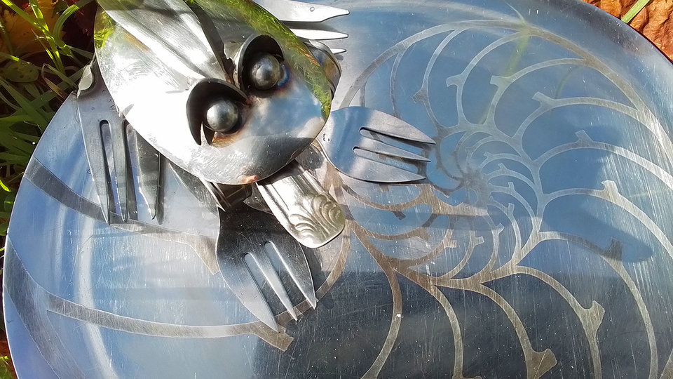 Our fabulous hand-crafted recycled stainless-steel, cutlery Frog on Ammonite Dish is a whimsical delight. This frog is made from up-cycled cutlery and he sits on a gorgeous Ammonite dish and would look beautiful on display in your home.
