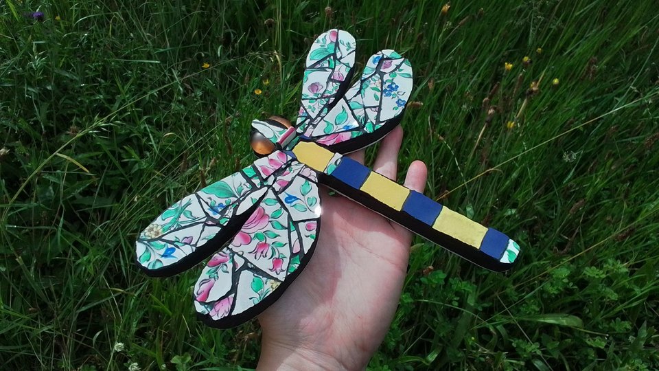 Our fabulous hand-cut recycled ceramic, Flowery Blue & Yellow Dragonfly is a whimsical delight in vintage brightly coloured flower patterned ceramics and is paired with an eye-catching yellow and blue.