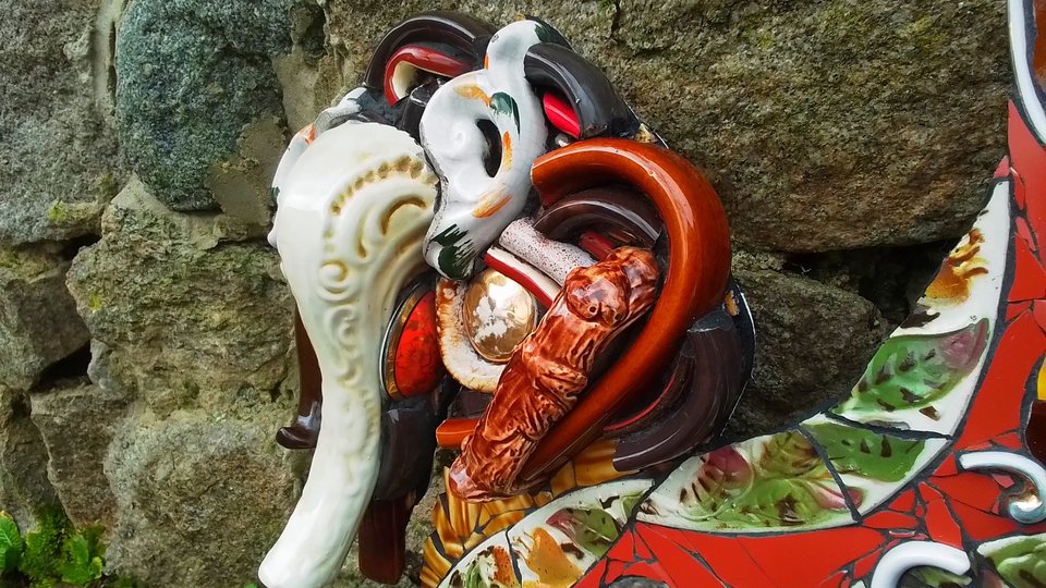 Vintage ceramics, MDF wood (base), grout, ceramic & glass embellishments, mirror and glass pebble eyes. Hooks and picture wire have been added for instant display.