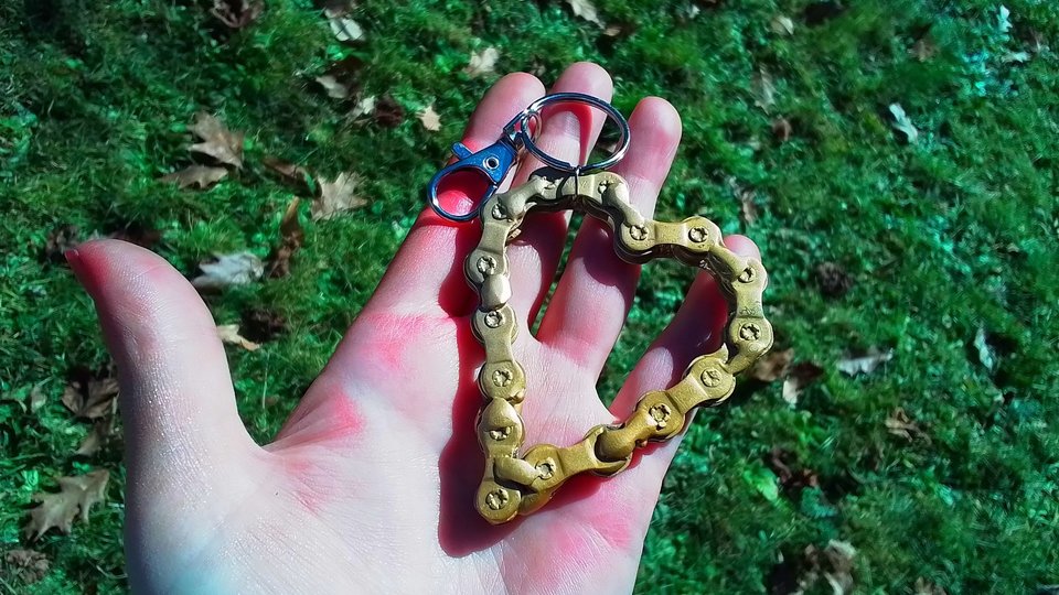 Bike chain, stainless-steel weld, gold enamel paint & keyring attachment.