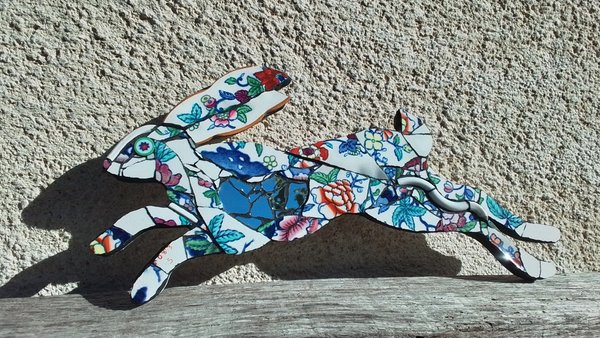 Our fabulous hand-cut recycled ceramic, Mini Red Flowery Hare is a whimsical delight in vintage red & white floral patterned ceramics.